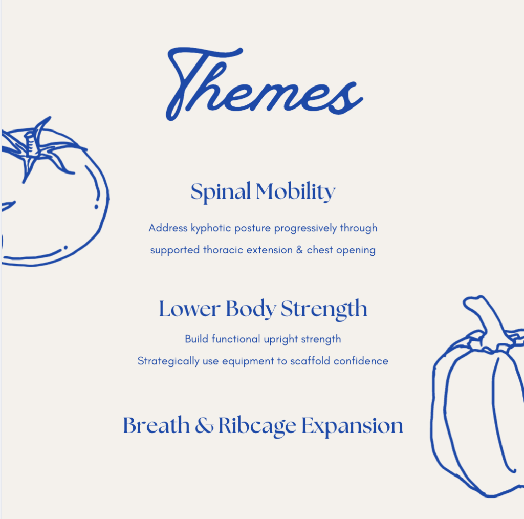 For this client, the primary goal was to address kyphotic posture gently and progressively through supported extension (well enabled by apparatus like the Barrel and Cadillac), while the secondary objective was to build functional leg strength to support balance and mobility in daily life, while working to reduce existing asymmetries.