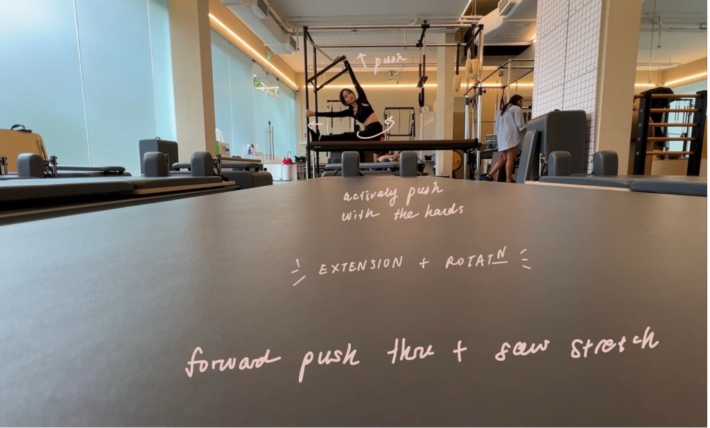 What I love most is exploring similar exercises across different equipment and noticing how the experience changes. Movement patterns like spinal flexion and hip extension exist across all apparatus. The biomechanics differ due to changes in support, load, and body orientation relative to gravity. For instance, a seated Cadillac exercise has a wide base of support and low balance demand, allowing focus on mobility or strength. A standing Chair exercise has a narrow base of support and higher centre of mass, increasing balance and stabiliser demand.